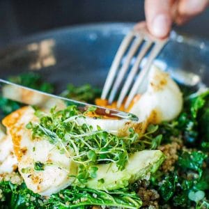 Add almonds and rosemary to your KitchenAid® K400 Blender. Close lid, select “Ice Crush” setting, and let blender run through the setting. Scrape down the sides of the blender with a rubber spatula, then replace lid and blend on speed 5 for 10 seconds. Scrape sides again and blend on speed 5 for a final 15-20 seconds, or until almonds and rosemary are finely ground.